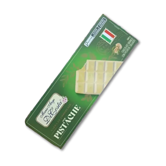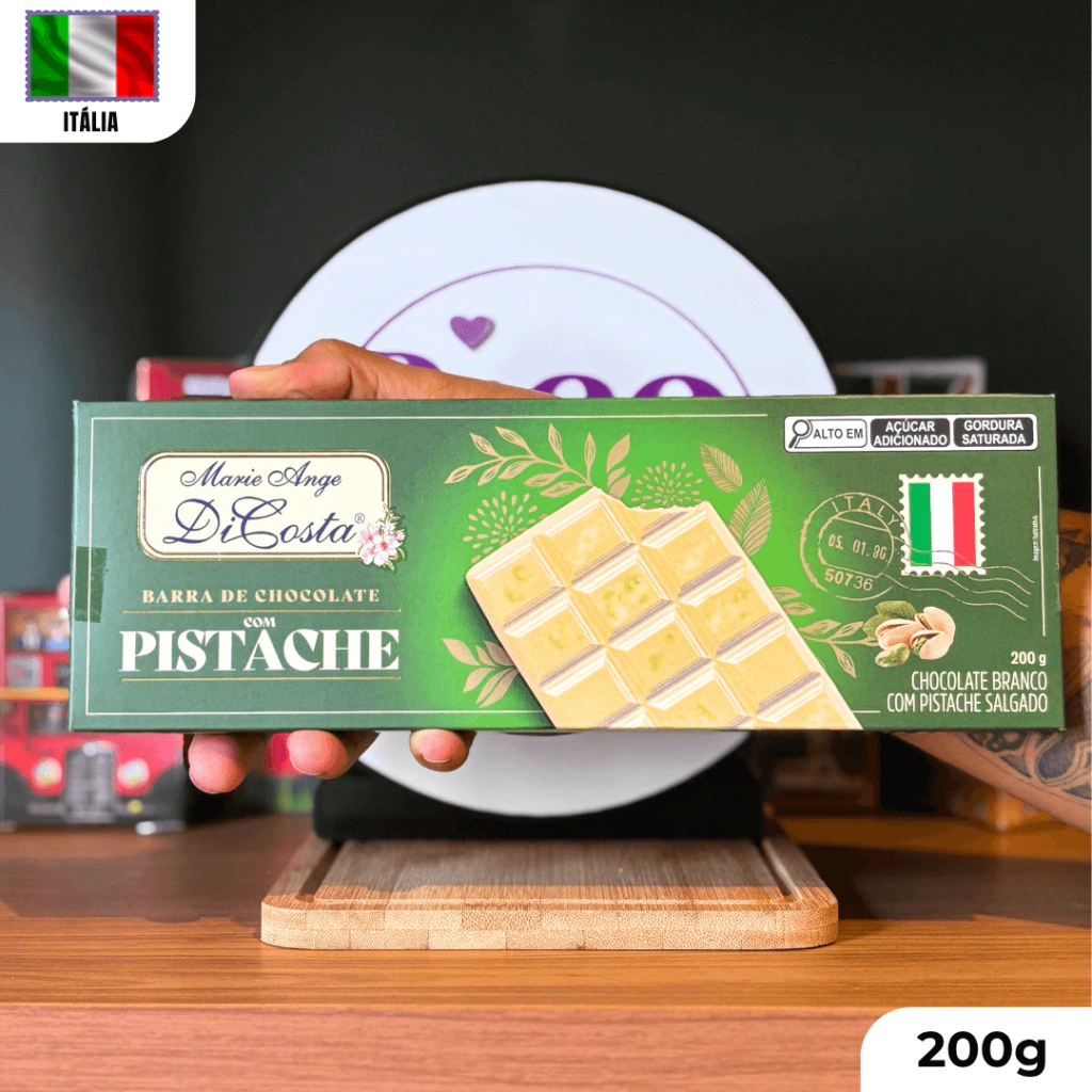 Diretamente da Itália para o seu momento de prazer! A Barra de Chocolate Branco Marie Ange DiCosta com Pistache é uma combinação irresistível de chocolate branco cremoso com pistaches salgados e crocantes, criando um contraste perfeito entre doçura e intensidade.